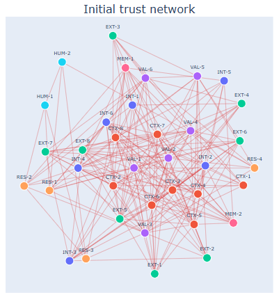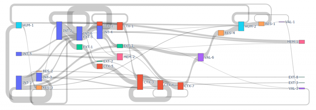 W bazowym scenariuszu symulacji powstaje wzorzec, gdzie kilku agentów jest wyraźniej obciążonych niż pozostali w danej roli (np. rola intake INT-*). Rośnie również obciążenie człowieka w wyniku eskalacji zadań (HUM-*). Na poniższym rysunku zaznaczono 10 najbardziej obciążonych połączeń między agentami, które odpowiadają wyżej pokazanemu obrazowi przepływu informacji w sieci.