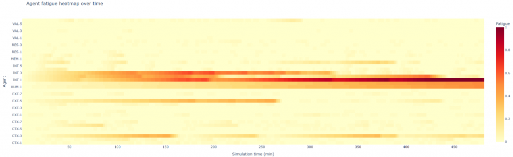 Obciążenie elementów sieci najlepiej można obserwować na mapie cieplnej poniżej. Wyraźnie widać, że agent INT-1 jest najbardziej obciążony, a obciążenie ludzi kumuluje się wraz z czasem pracy.